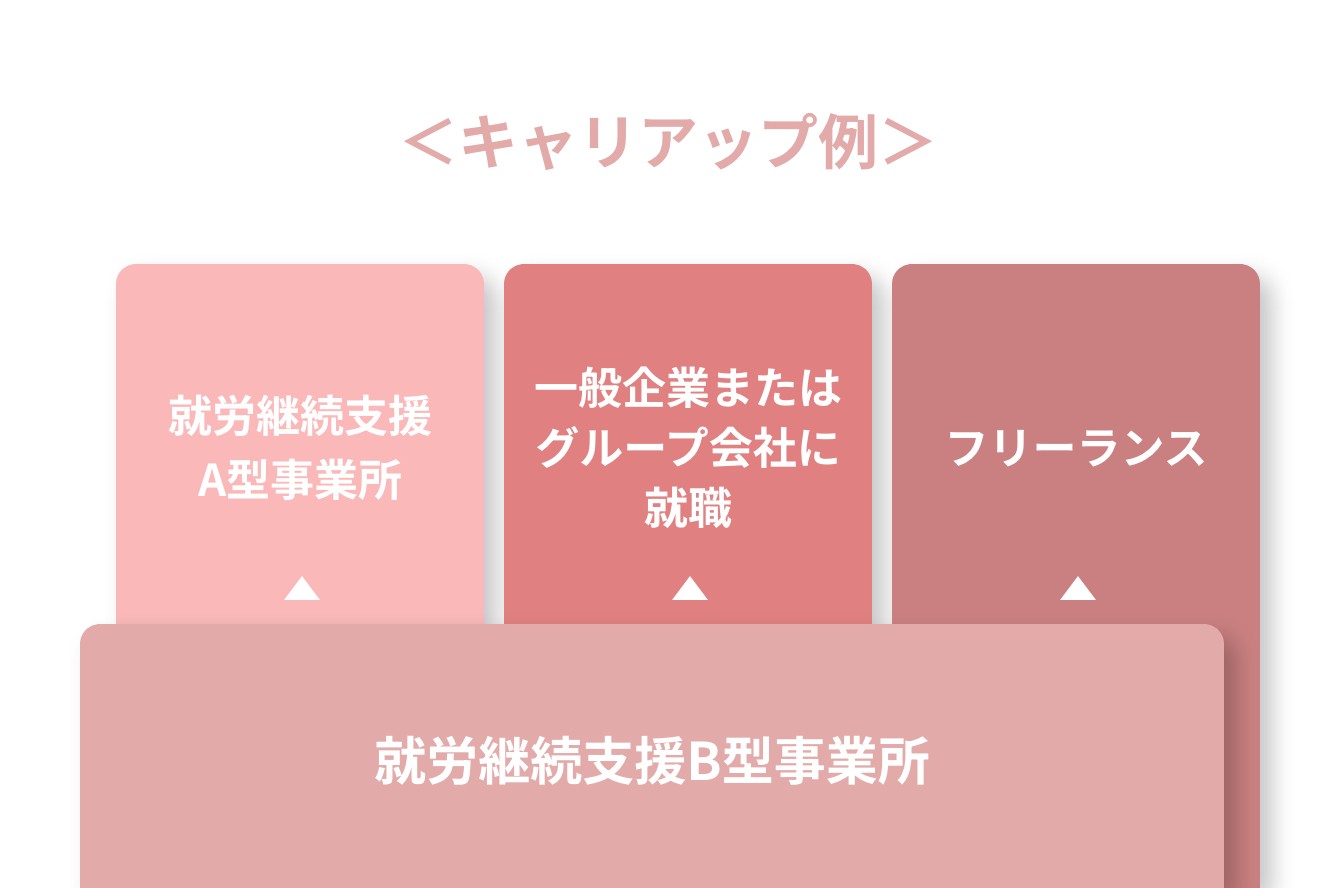まずは生活リズムを整えたい、仕事を辞めてからブランクがある、就職に必要なスキルを身に着けたい等、あなたの状況に合わせて就労支援プランを立てさせていただきます。就労支援の状況によって、B型からA型へのステップアップや