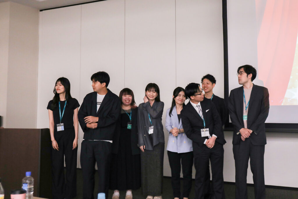 ステージ上で発表を待つ登壇者たちと、応援席で見守る仲間たち